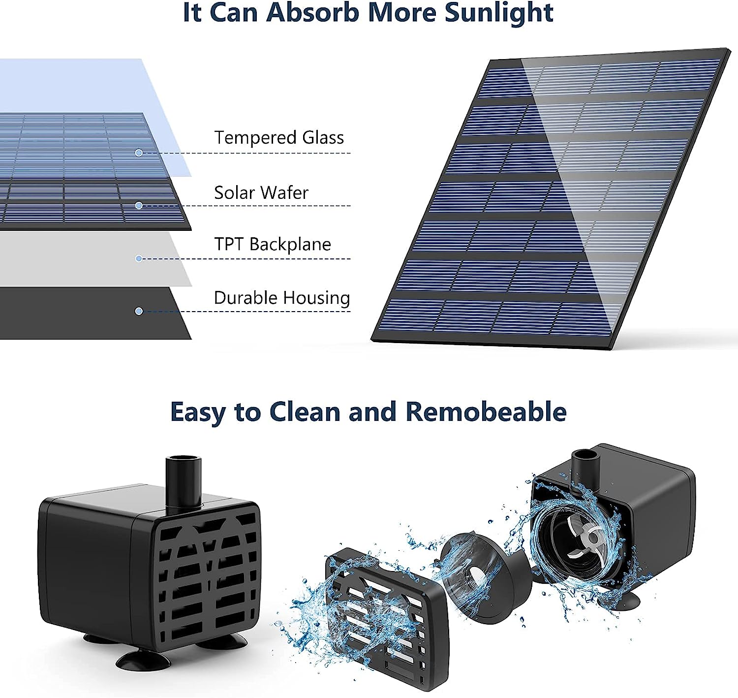 • [✔Eco-friendly And Safe]: It does not need batteries or electricity, it is completely controlled by solar energy. So, it is very environmentally friendly. This solar water pump kit is very safe from users without any danger. It is a perfect patio and garden decoration.